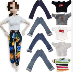 ชุดเดรสเสื้อยืดตัวยาวแบบลำลองขนาดเล็ก30ซม. ขนาด1/6ชุดเดรสและกางเกงยีนส์งานแฮนด์เมดกางเกงลายการ์ตูนนุ่มนิ่มสำหรับเด็กผู้หญิง